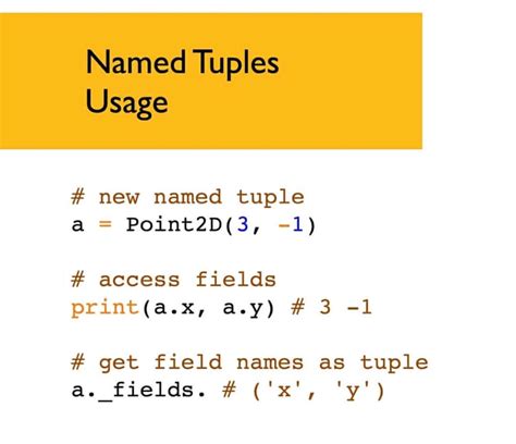 To address this challenge, Python introduces the concept of named tuples, an enhanced version of traditional tuples that allows you to assign meaningful names to each element.